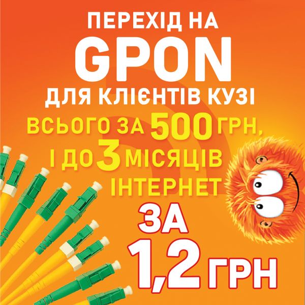 Переходь на GPON* всього за 500 грн + 1,20 грн на баланс та отримуй до 3 місяців